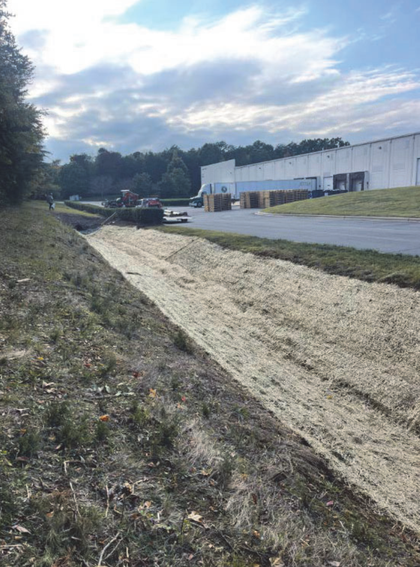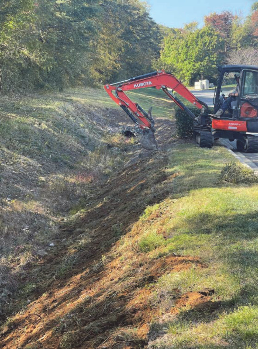 Work began at the inlet structure, where a mini excavator was used to remove accumulated sediment and riprap. The swale was excavated to remove sediment and woody vegetation, then backfilled and compacted to restore proper elevation and design grade. This ensured that water exited the pipe correctly and was safely slowed to prevent downstream erosion. A layer of filter fabric was placed over the area to separate the soil from the riprap, enhancing stability. The slopes and bottom of the swale were regraded for stabilization, and new riprap was installed at the inlet to protect against erosion caused by incoming flow. All disturbed areas, including the basin bottom, were stabilized using a seed mix, covered with erosion control blankets, and secured with sod staples to prevent future erosion.