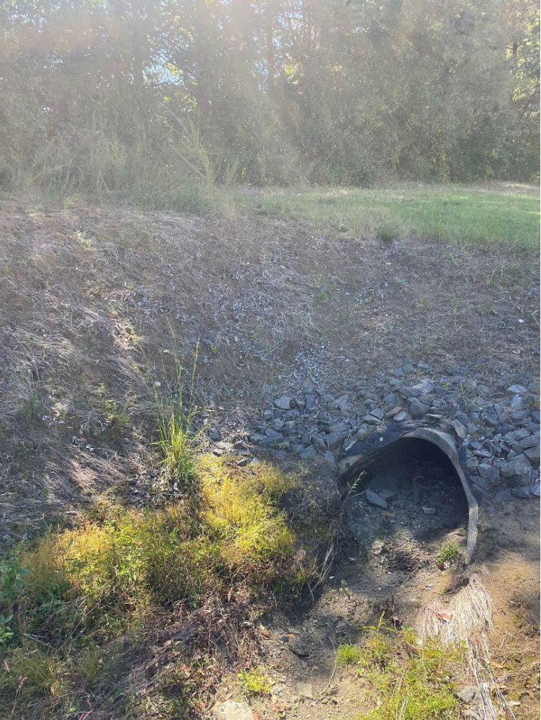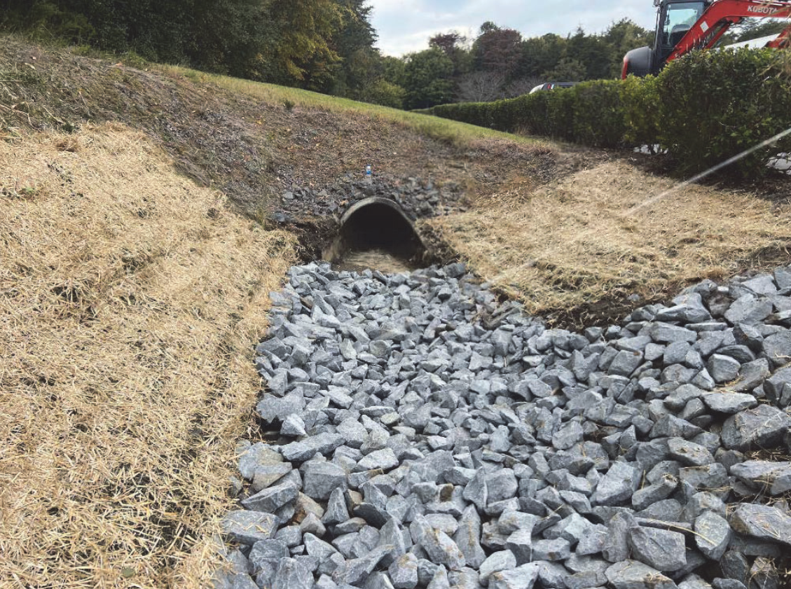 One of the key issues identified was sediment buildup at the inlet leading to the swale. This accumulation restricted water flow and created blockages, reducing flow capacity, especially during heavy rain events. If left unresolved, this can cause flooding and, over time, may result in more severe infrastructure damage to the pipe itself, such as corrosion, pipe sagging or joint failure. Additionally, the inlet concrete flume, which is designed to slow and guide runoff into the drainage system, had become obstructed by sediment buildup and was no longer effective. Built-up sediment in the area needed to be removed and the rip rap needed to be replaced to meet original design specifications and restore optimal performance.