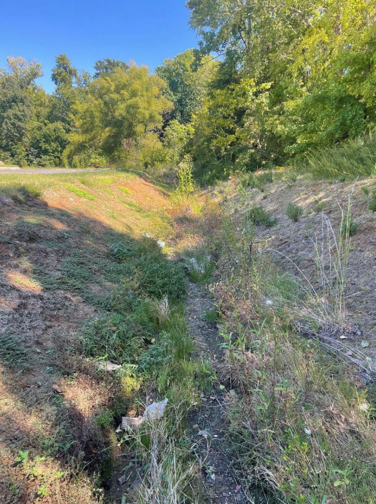 Due to the sediment buildup around the inlet, the swale was also compromised. Sediment and woody vegetation covered the bottom of the swale hindering the capacity of the asset. The sides of the swale were bare, indicating runoff was destabilizing the slope and depositing sediment in the bottom of the basin. Without grass along the slopes, runoff is more likely to lead to erosion and the sediment will be deposited somewhere else inside the stormwater system. This is a common failure of stormwater systems.