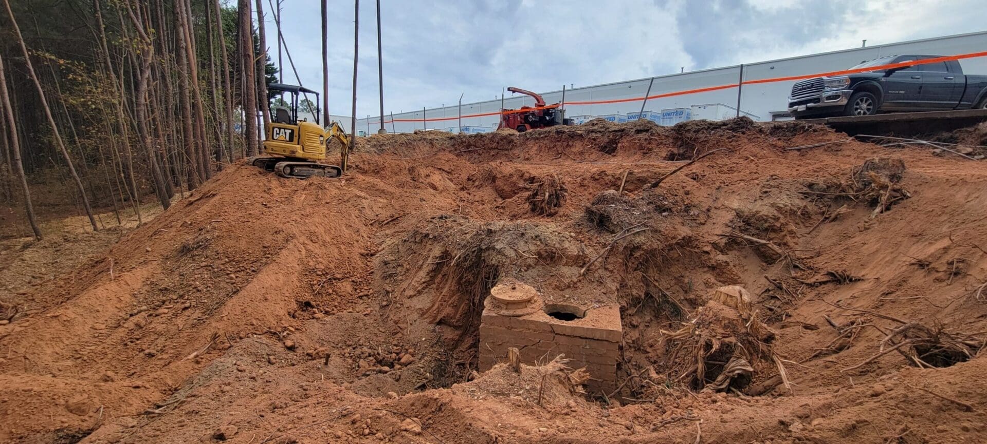 AQUALIS began excavating the area to remove the root balls and unsuitable soils to allow access for repairs. To ensure the surrounding parking lot did not suffer damages during construction, the concrete parking pads within the limited area of disturbance were removed. This ensures the entire compromised parts of the system could be removed safely and the area could be properly regraded and compacted.
