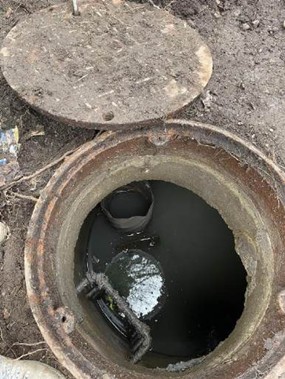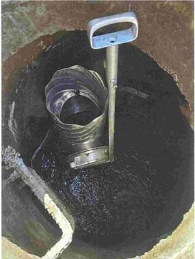 Once the buried manhole was excavated and the area was regraded, the downstream pipe could then be evaluated. Upon this inspection, additional damage was found, confirming the need for a more comprehensive repair. During the inspection process, the team also uncovered that the flow control device inside the stormwater vault was significantly deteriorated and no longer functioning as intended. Flow control devices are often installed inside stormwater vaults to unction as a capacity valve that can be manually overridden. Normally, the control device allows the approved amount of stormwater overflow but in extreme circumstances can allow for the vault to be emptied or filled further.