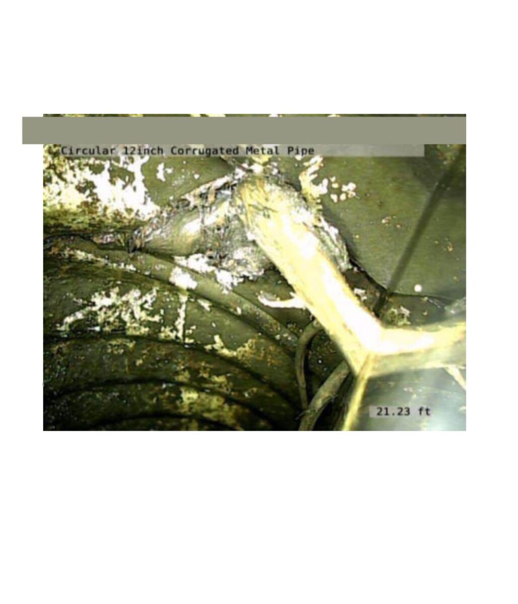 Due to the location and nature of the property, AQUALIS utilized the local utility location company to identify underground utilities. During this search, a buried manhole cover was located under approximately two feet of soil. Buried manholes restrict access to the pipe and indicate significant soil disruption. After excavating and clearing the area, the team began inspecting the pipeline, starting with the upstream section. They used CCTV (Closed-Circuit Television) to assess the pipe’s condition. This method allowed the team to view internal pipe damage with minimal disruption to the surrounding area. During the inspection, they identified extensive damage caused by invasive tree roots and corrosion. Roots had penetrated the pipe, creating an opening for water to flow in or out of the pipe freely, disrupting proper water flow. Root intrusion is one of the most common reasons for pipe failure. As trees and bushes grow, their root systems expand underground compromising infrastructure like this stormwater pipe.
