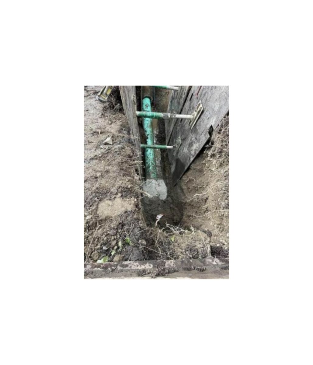 After verifying the slope of the new pipe was to original specifications, the connection to the original pipe was reinforced and armored with concrete. The new pipe was then bedded in gravel, and the trench was backfilled using the original excavated soil.